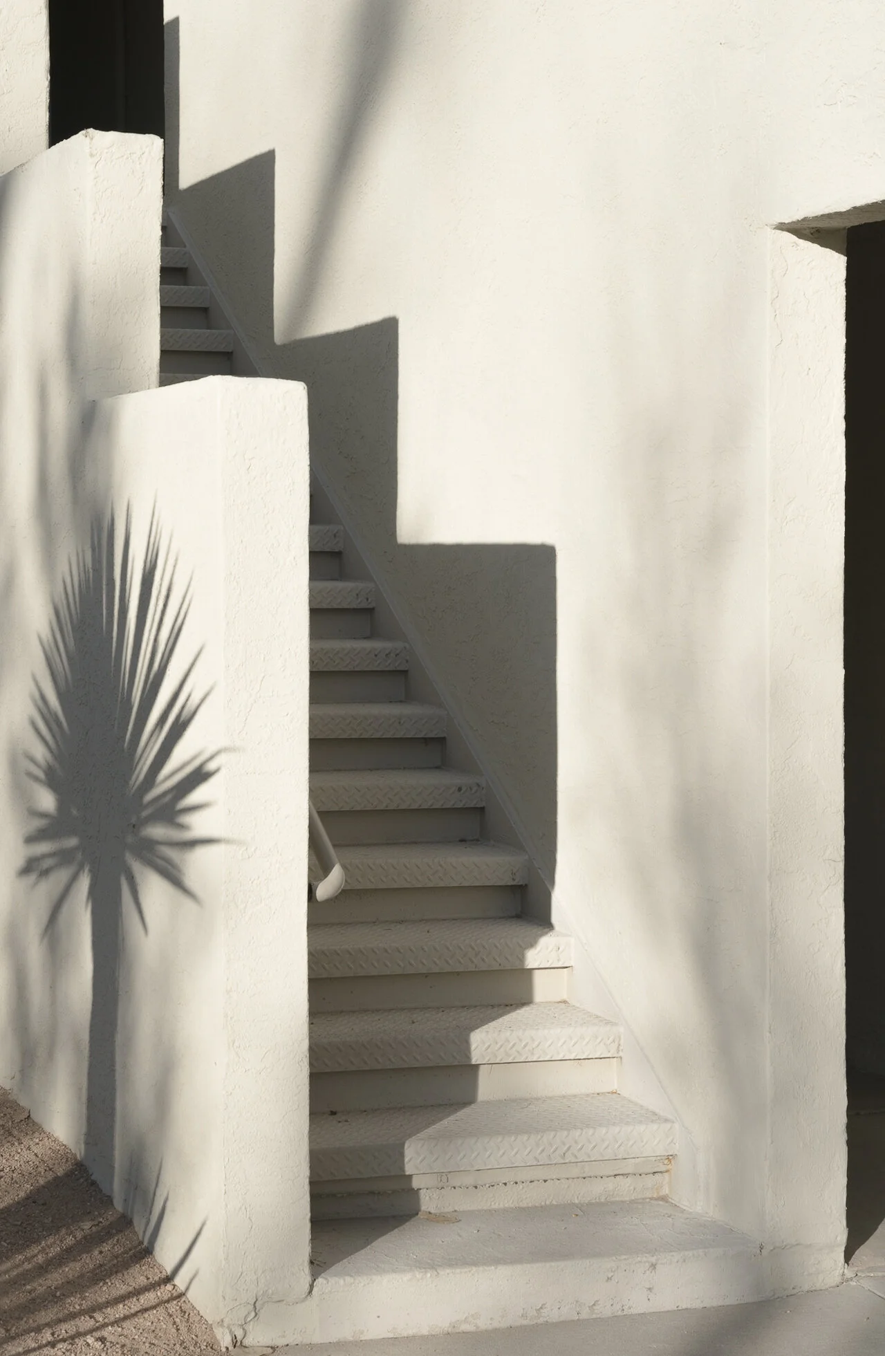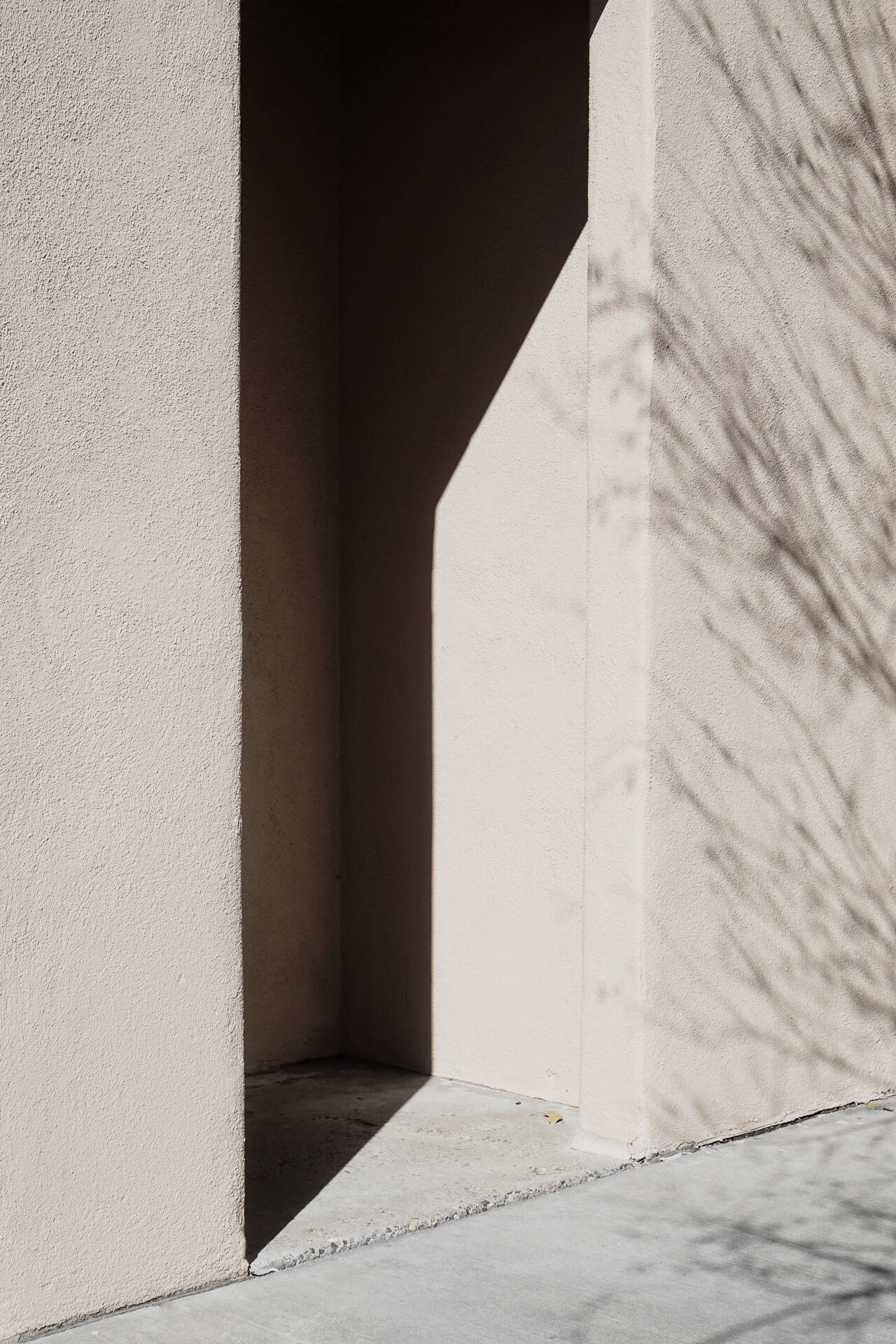 About a year ago, a subset of photographs crept into this body of work. I realized that faint “presences” were appearing in my images as ghostly shadows of vegetation against otherwise the typical stucco walls that line Southwestern architecture. These intangible presences, like phantoms, were superimposed onto the built environment of manmade, manufactured structures. The formal, linear framework of architecture persisted in this work as a more elusive organic element had begun entering my compositions.